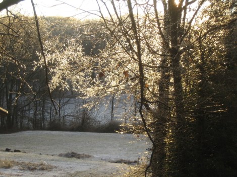Sun filtering through some icy trees at my parents' house in New York